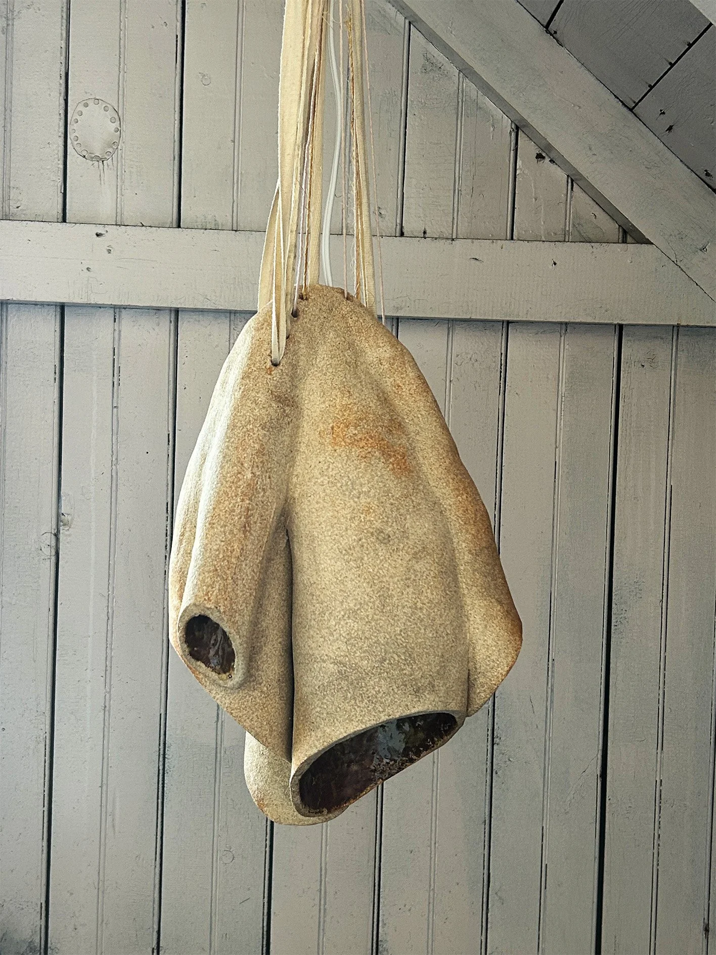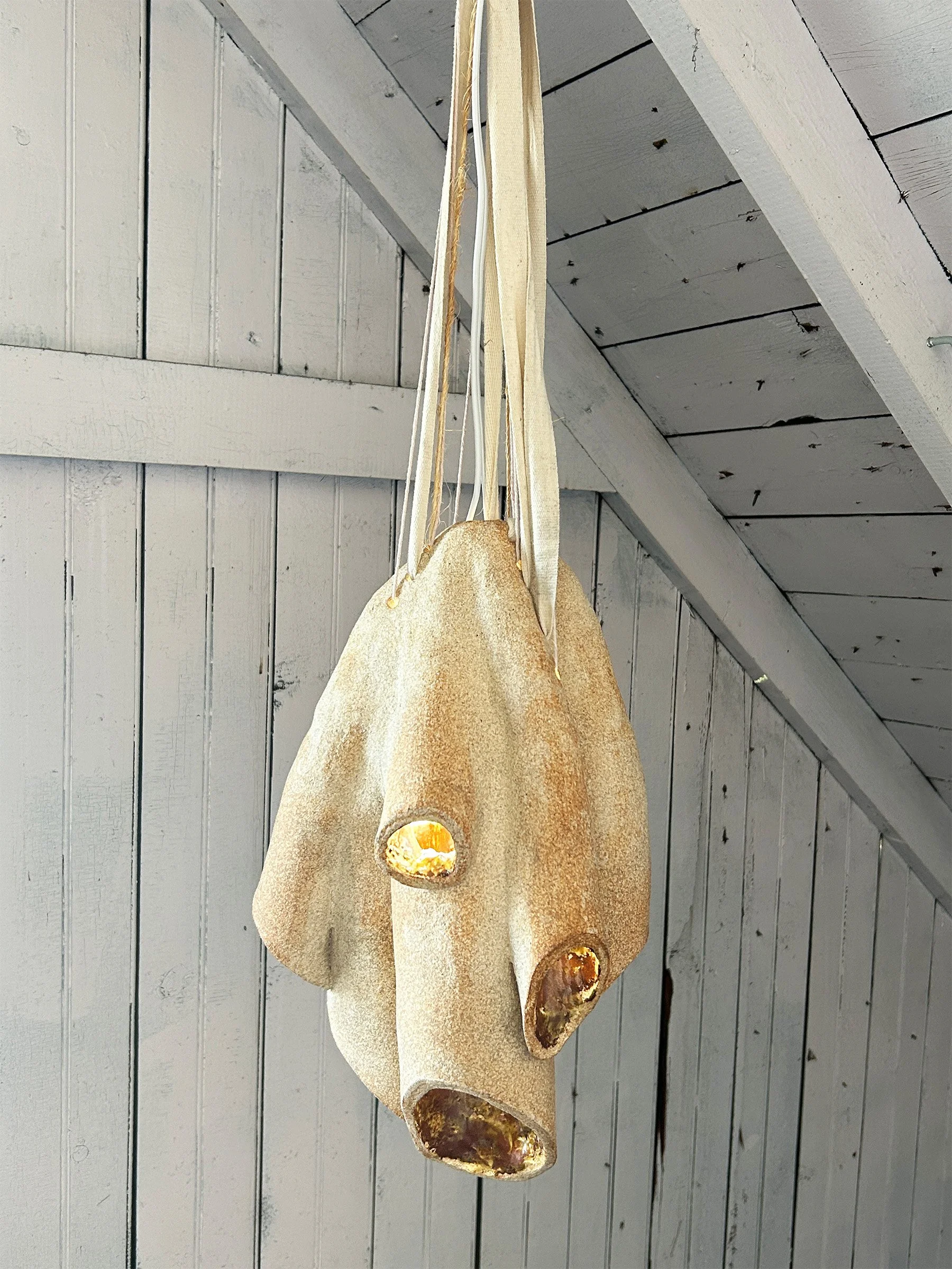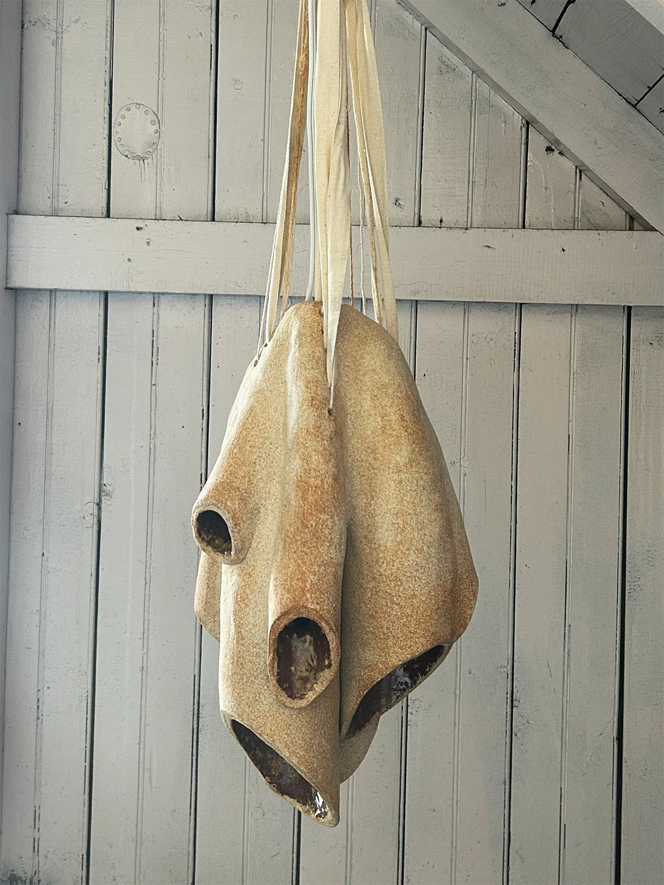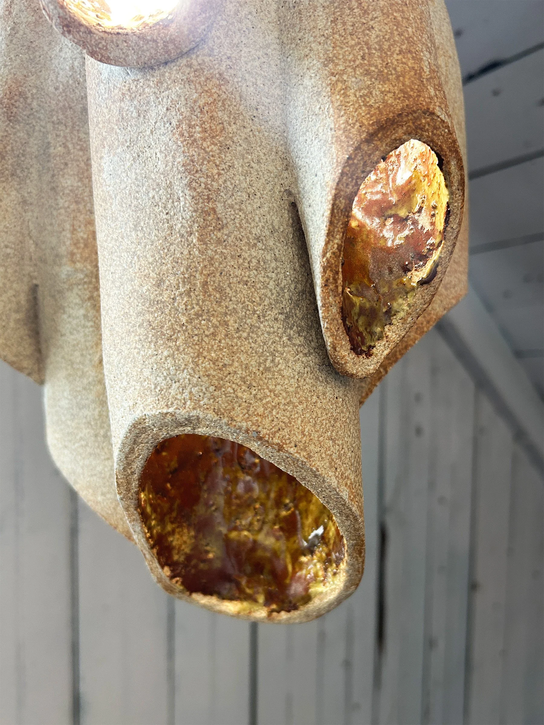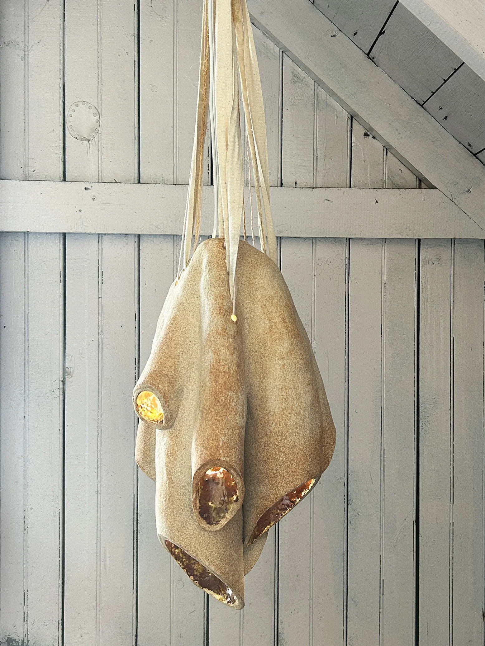 MULTI PENDANTSTONEWARE, HIGH FIRE GLAZE, LINEN, WIRE, COTTON TWINE AND LIGHT BULB10” X 12” X 17HANGING HEIGHT ADJUSTABLE