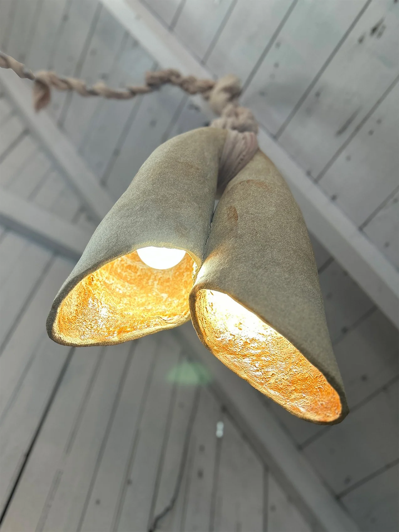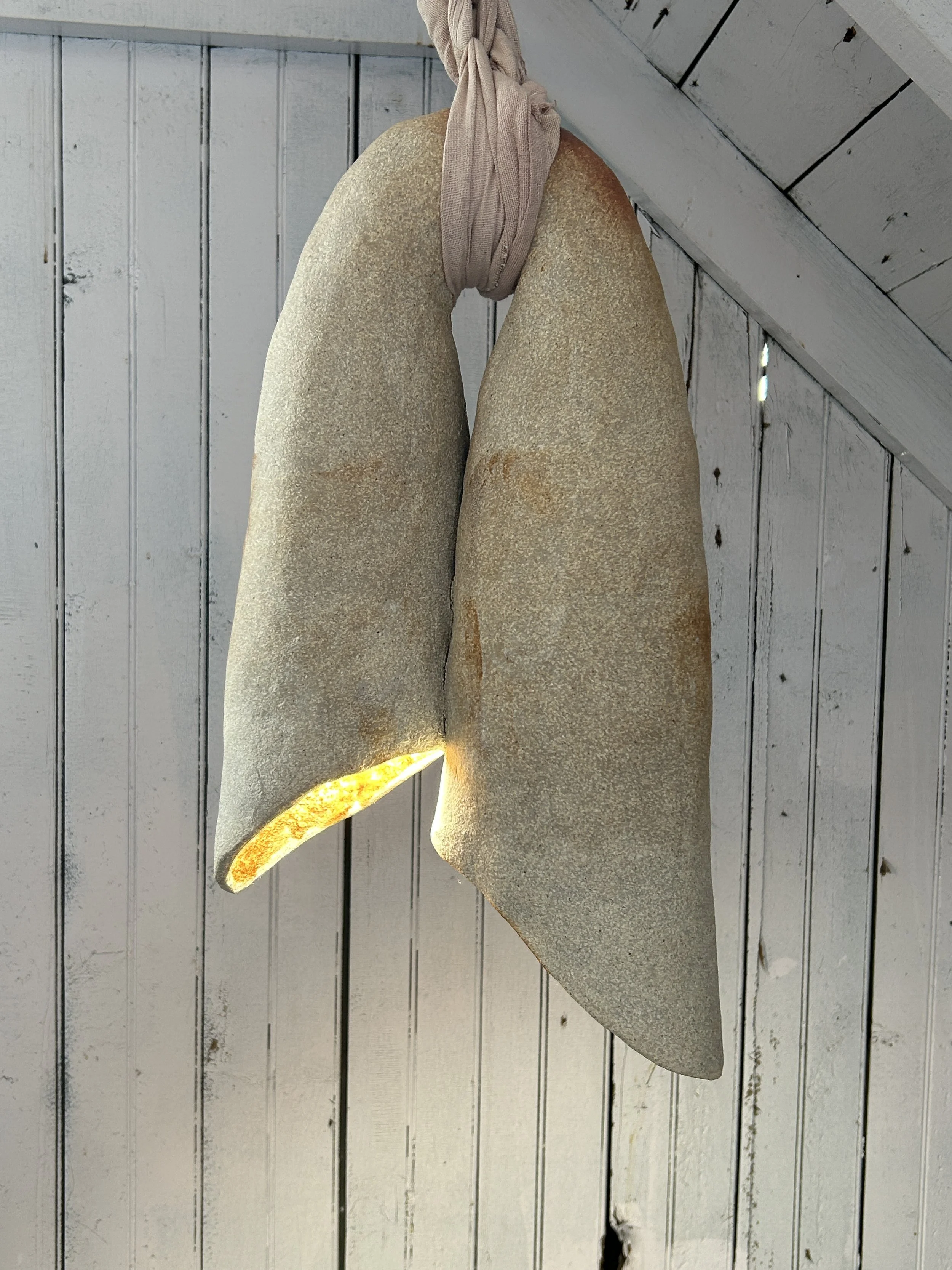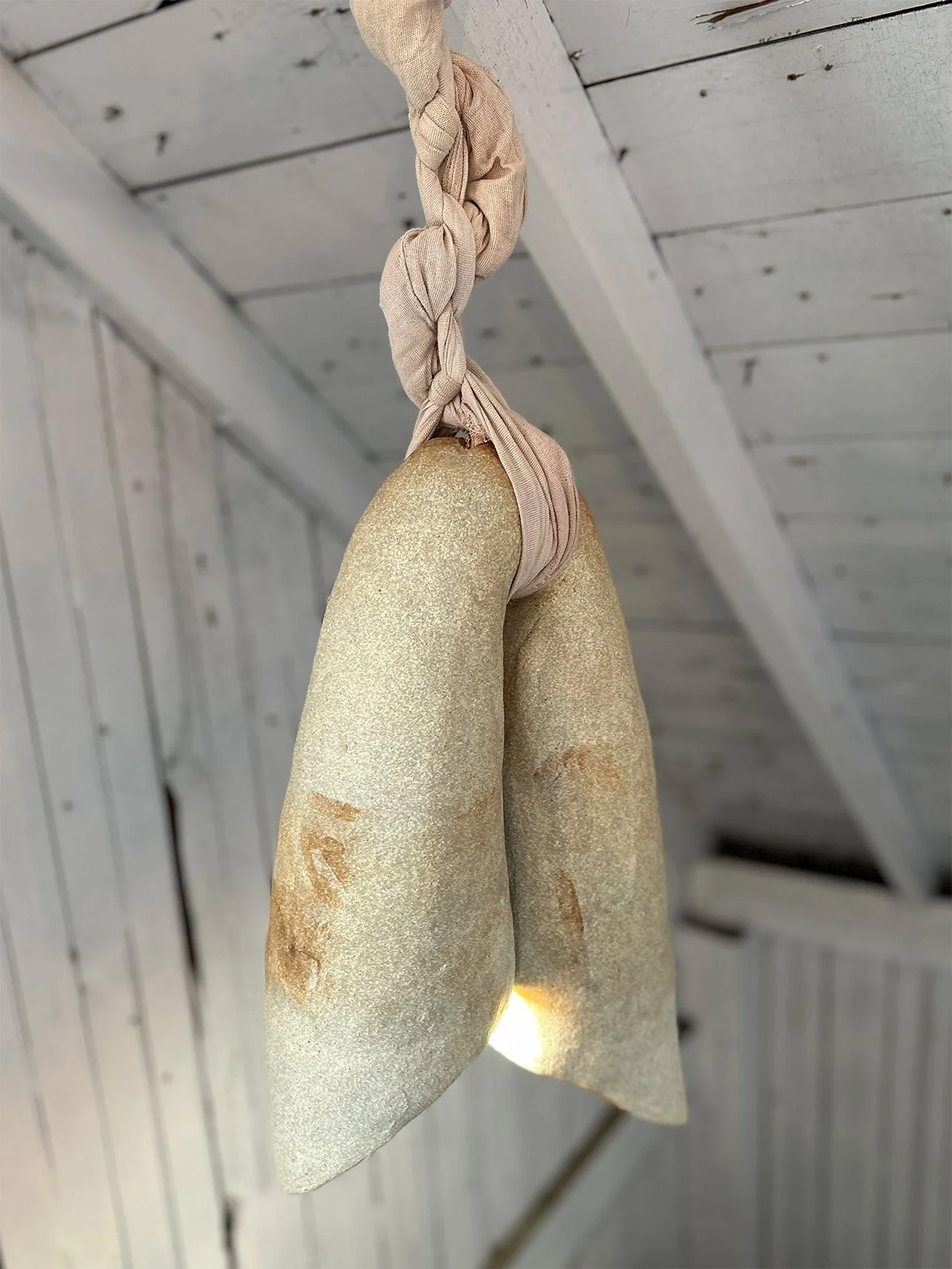 STONEWARE, HIGH FIRE GLAZE, HAND DYED LINEN AND TWO LIGHT BULBS