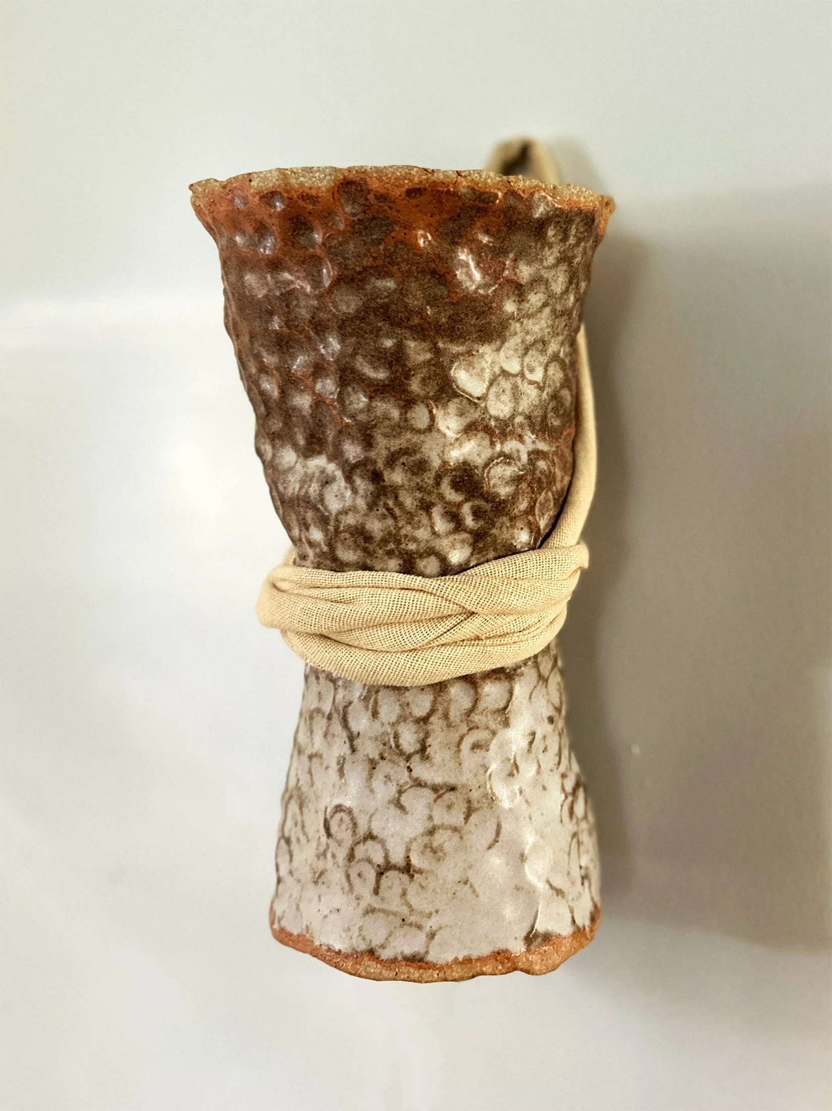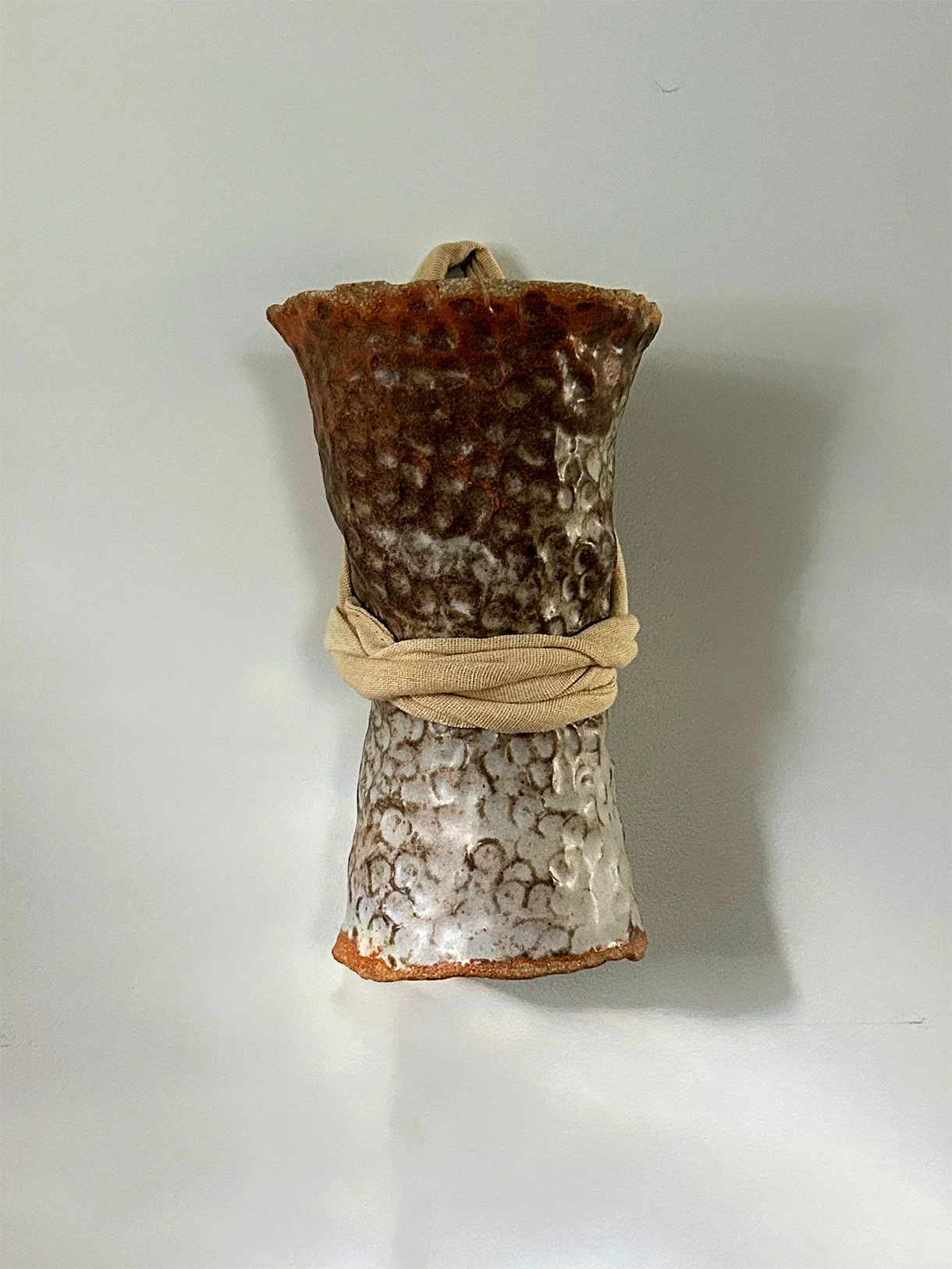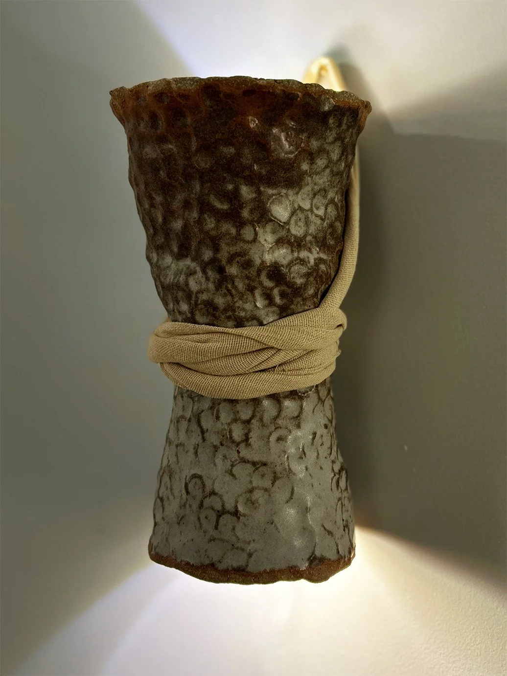 STONEWARE, HIGH FIRE GLAZE, HAND DYED LINEN AND LIGHT BULB